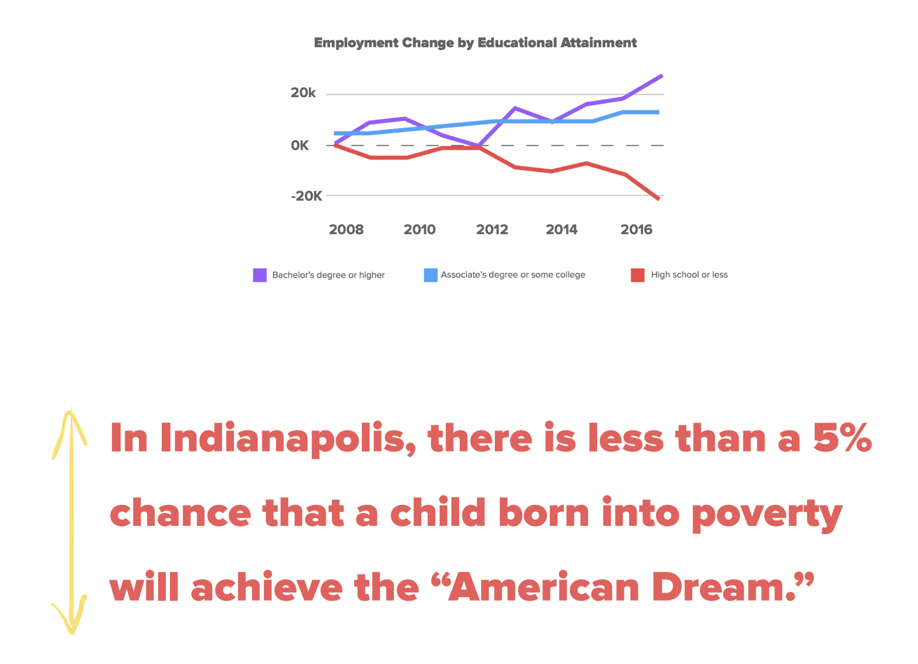 By 2020, 62% of jobs in Indiana will require some form of post secondary credential, yet just 42% of Marion County residents currently have the requisite high-quality credentials. To close this gap, the city would need an additional 215,000 adults with a job-ready credential.